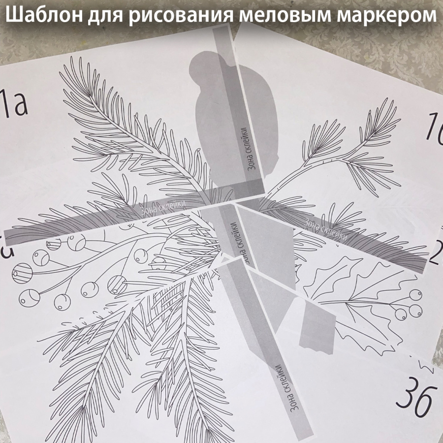 Венок вокруг карандаша - это рисунок меловым маркером на электростатической пленке. Пленка продается на маркетплейсах, в рекомендациях по расходным материалам я дала ссылку на широкую, можно купить на 60 см шириной, такой много. Пленка держится на стекле без клея, за счет физического притяжения, окна после нее мыть не надо. Чтобы Вам было легко рисовать, я подготовила шаблон с контурами рисунка. Шаблон на стол, пленку сверху и рисовать по пленке - получается большая раскраска для работы меловыми маркерами. Маркеры можно белые или цветные, как Вам больше нравится. У меня белый.