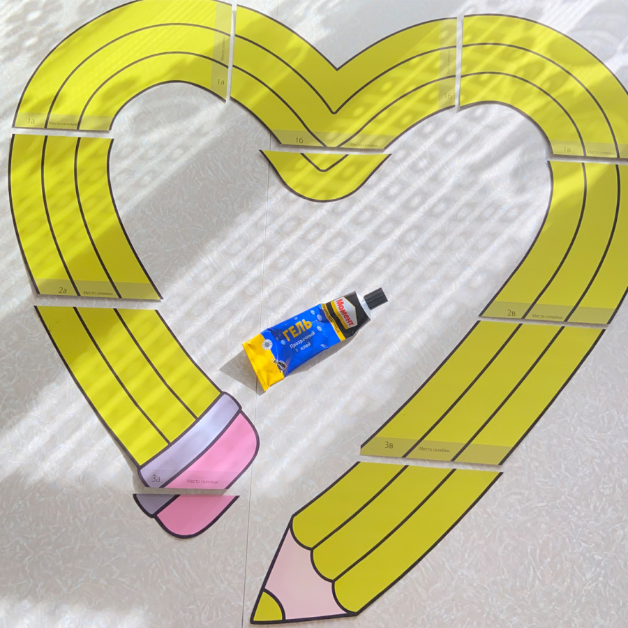 Центральная часть композиции - карандаш в форме сердца и надпись "Выпуск" + год. Размеры сердца 75*60 см и, несмотря на сложную форму и черные линии, склеивается легко и четко по инструкции. Надписи на подложках, чтобы не пришлось вырезать мелкие детали и прорезать отверстия внутри букв. Печать на листах А4.