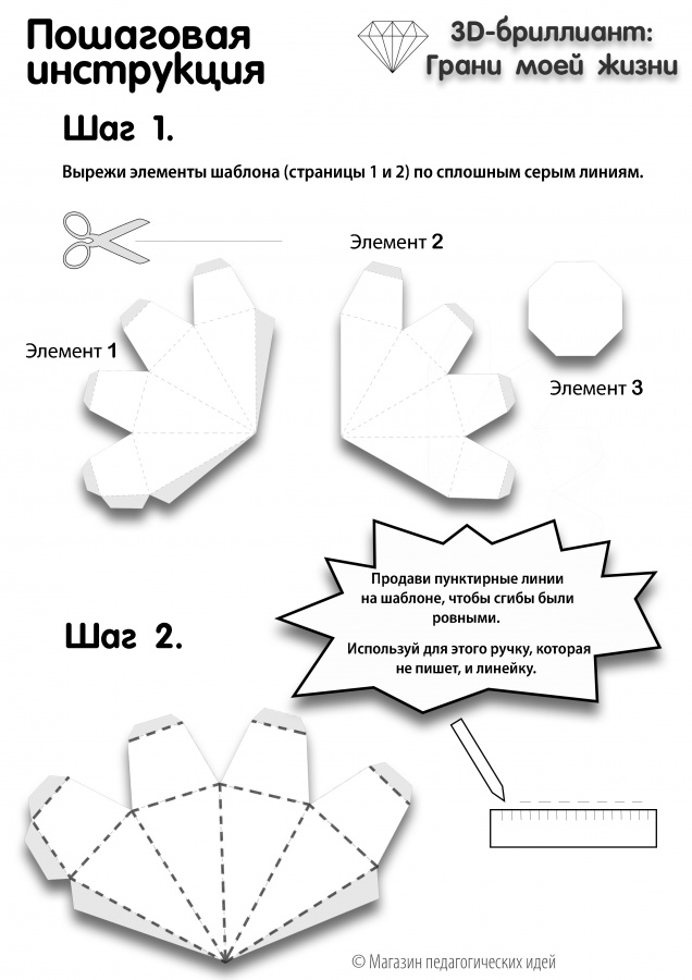 Бриллианты - сверкающие драгоценности, ассоциирующиеся с блестящей карьерой и выдающимися достижениями. Что может быть лучше?! Только рассказать о себе - своих талантах и увлечениях на гранях бумажной модели бриллианта! Это можно сделать ну уроках ИЗО/Технологии, классном часе или внеклассном мероприятии.