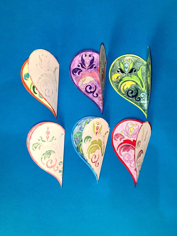 Эффектные украшения для класса и дома - объемные сердца, склеенные из 6 сторон с одинаковым орнаментом. Наиболее эффектно выглядят украшения, стороны которых раскрашены в одном стиле. Можно использовать краски с блеском, золотые и серебряные маркеры, объемные контуры, глиттер.