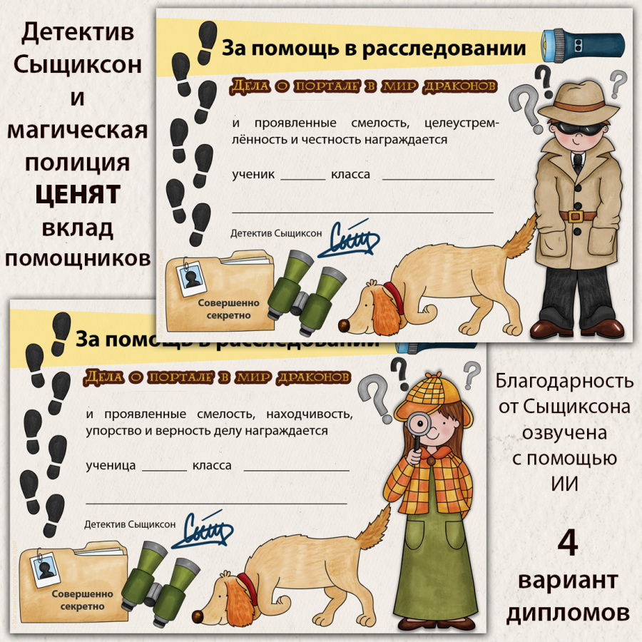 Магическая полиция и лично детектив Сыщиксон будут благодарны Вашим ученикам за помощь в расследовании, и подготовили специальные дипломы для юных детективов - мальчиков и девочек. Дракон-смотритель тоже признателен, и передал маленькие шоколадки (15 г) в драконьих обертках ).