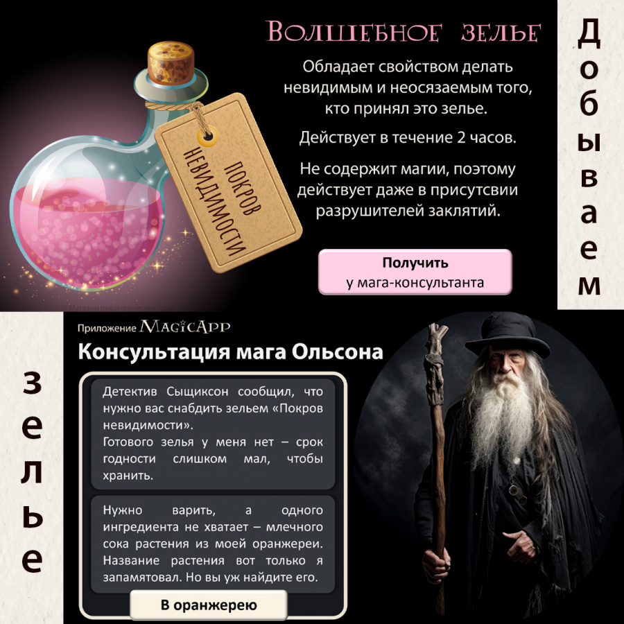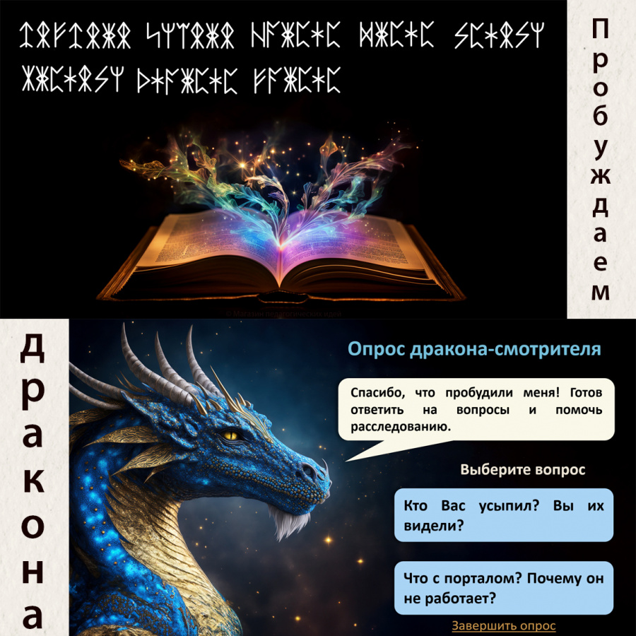 А еще, квест волшебный. И для того, чтобы это волшебство вошло в классы, искусственный интеллект озвучил немножко текста, а я придумала интерактивные элементы: диалоги с выбором реплик и ответами персонажа в зависимости от выбора, интерактивный определитель магических созданий, интерактивная карта Волшебной долины, интерактивное внутреннее пространство дома персонажа, где нужно найти кристалл. Немножко физической магии - проявляем симпатические чернила, чтобы получить пароль для доступа к письму от Деда Мороза. И еще потрясающие иллюстрации магических созданий, оранжереи с магическим растениями, мудрым и добрым драконом. И просто магическим антуражем, больше похожим на современную игру. Вот хочется мне, чтобы образование было ближе к детям ) А этот квест, он не только про развлечение, но и про обучение: работа и с информацией в различной форме, сравнение и анализ данных, смысловое чтение, удерживание цели.