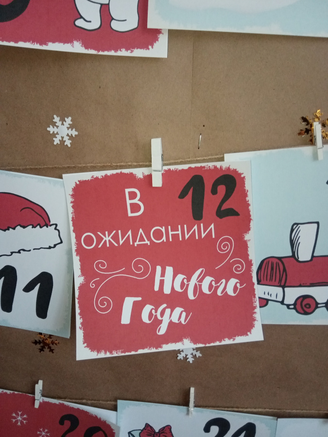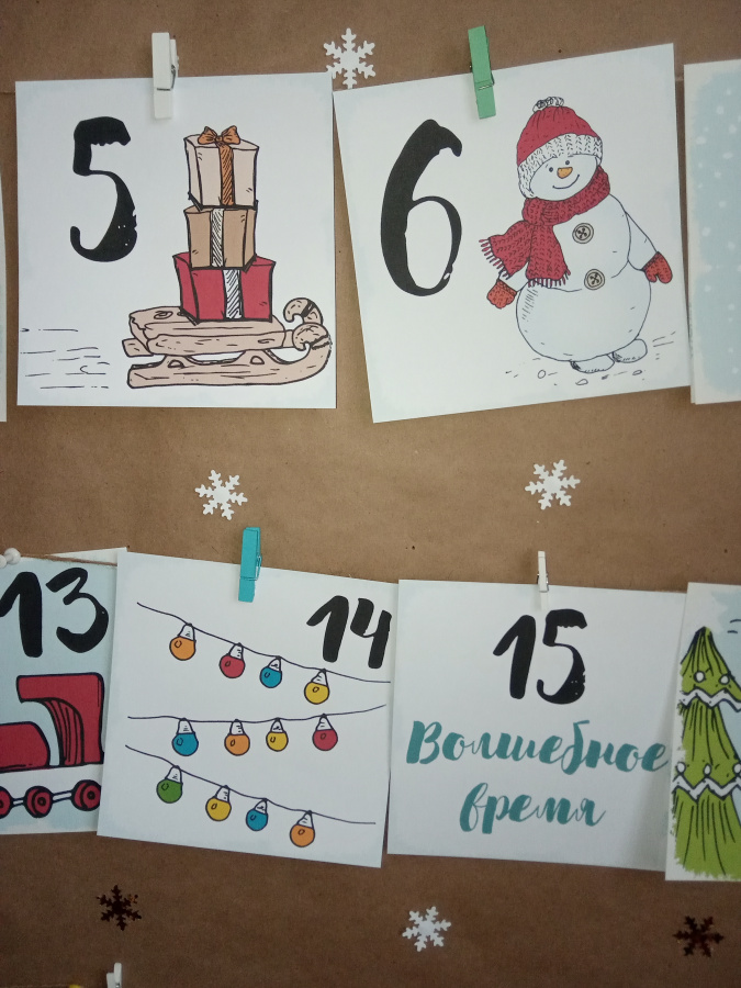 Элементы Адвент-календаря для класса крупные (15*20 см), чтобы всем ребятам было их хорошо видно. С помощью данного комплекта Вы можете оформить под Адвент-календарь пробковую доску или поместить его на ватмане и закрепить на стене.