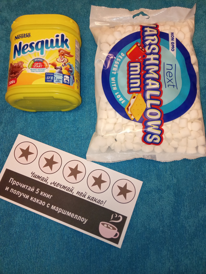 После прочтения книги ребенок заполняет отзыв на нее и вешает с помощью прищепки на натянутую бечевку, чтобы другие ребята могли увидеть отзыв, а учитель делает отметку в карточке участника (штамп или наклейка). Когда набирается пять отметок, ребенок получает какао с маршмеллоу и новую карточку.