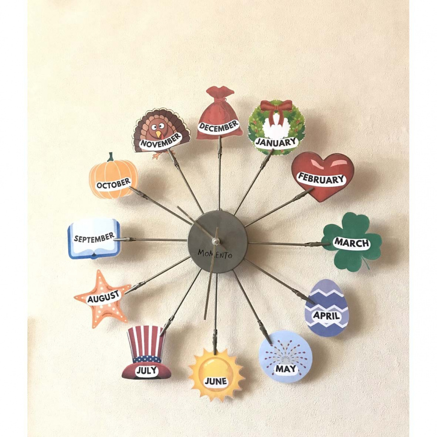 Подобные часы будут всегда перед глазами учеников, так им легче всего будет запомнить написание цифр, месяцев, также, если вы будете использовать карточки с картинками, соответствующими праздникам этого месяца, дети будут интересоваться, почему именно такой рисунок, расширяя свой кругозор по теме страноведения.