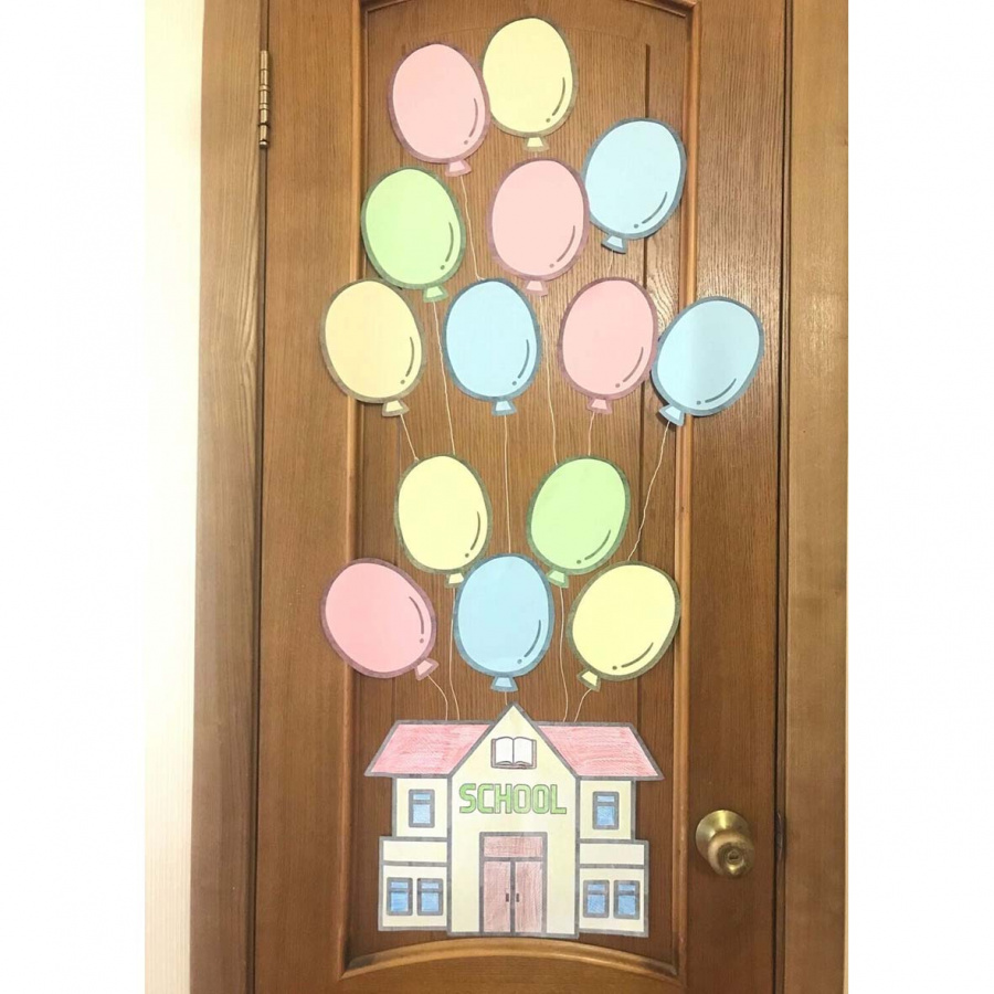Можно задекорировать дверь снаружи или изнутри, доску или просто свободное пространство стены. Здание символизирует школу, а шары - ее учеников. На каждый шар можно приклеить имя и/или фото ученика.