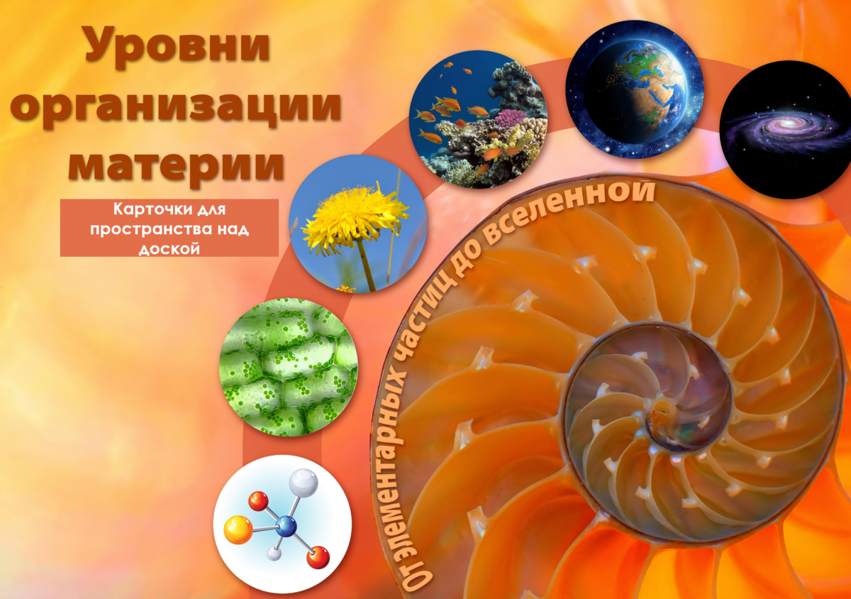Оформить пространство над доской - большое дело, ведь эта область привлекает внимание наших учеников чаще всего. Карточки для декора "Уровни организации материи" - это декор в акварельном стиле и предметное содержание одновременно.