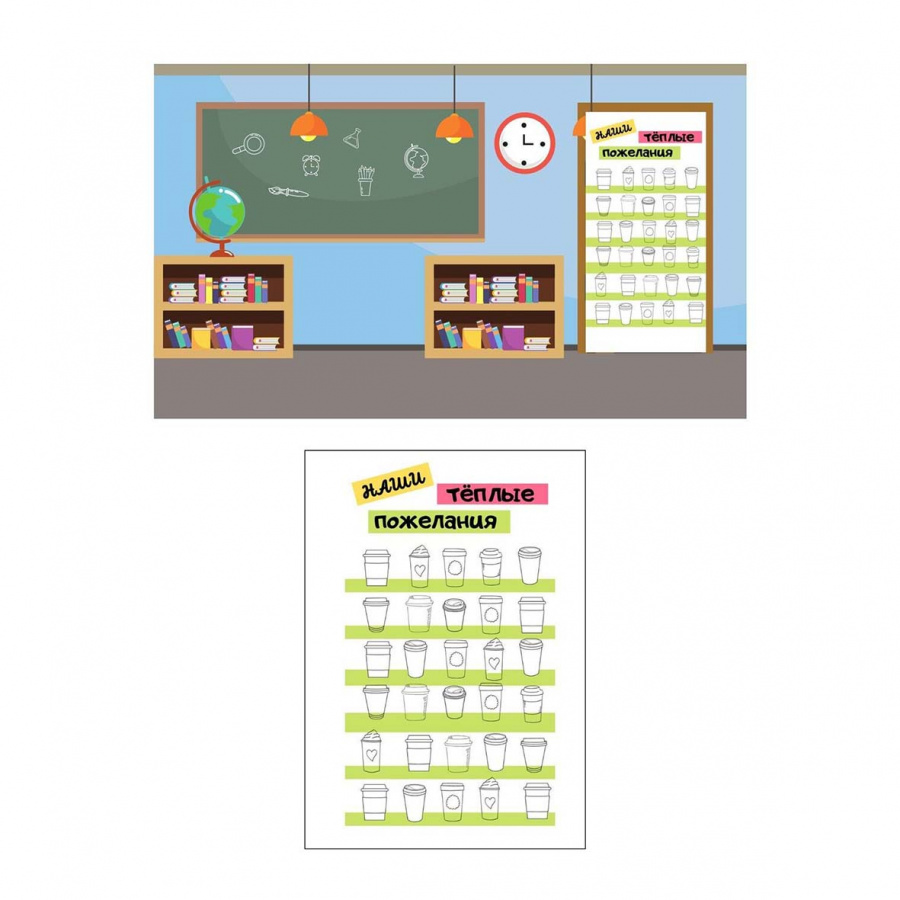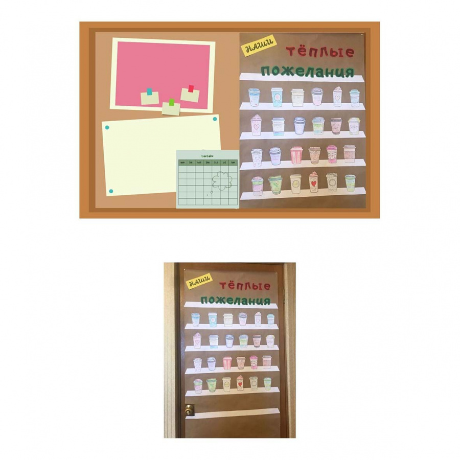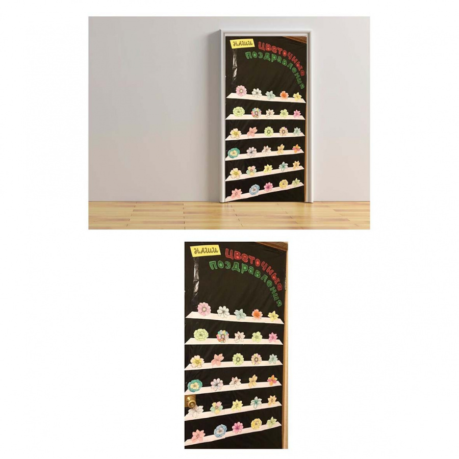 Один раз оформив дверь или любую другую удобную поверхность (дополнительная доска/плакат) в виде полочек, вы сможете использовать ее весь год. В материале вы найдете заготовки стаканчиков для теплых пожеланий от каждого ученика, сердечек для поздравлений с Днем святого Валентина, а также звезды, которые можно использовать не только на 23 февраля, но и для отметки «звезд» класса (победителей конкурсов, спортсменов и тд). А красивые цветы можно оформить и на полочки как поздравления от мальчиков девочкам на 8 марта, и в виде букета в вазе, например, для того, чтобы отметить День матери.