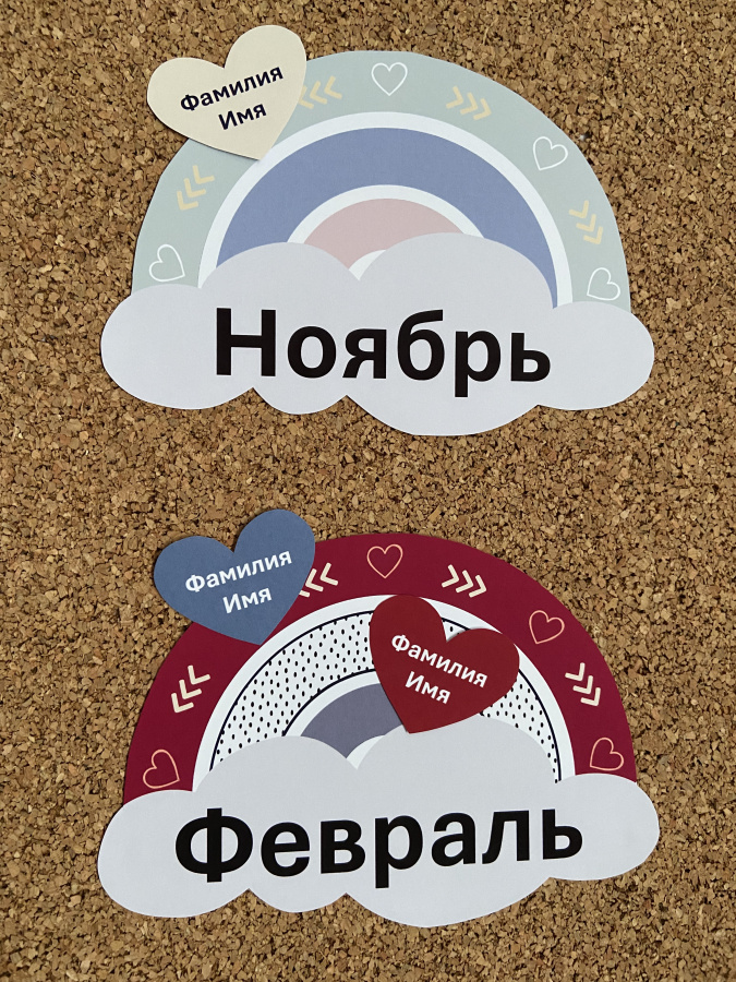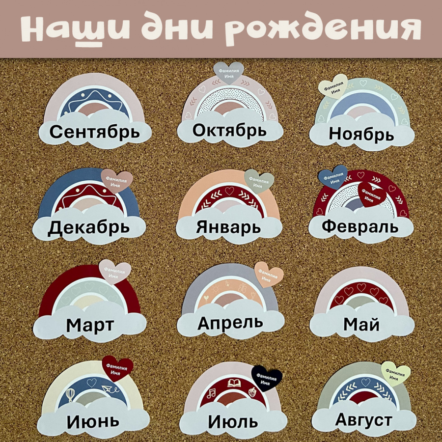 Радуга - символ детства, а наши радуги в стиле Бохо не такие яркие, как природное явление, но очень милые и добрые. По одной радуге для каждого месяца календарного года и сердечки с именами учеников, которые нужно прикрепить на радугу с нужным месяцем.
