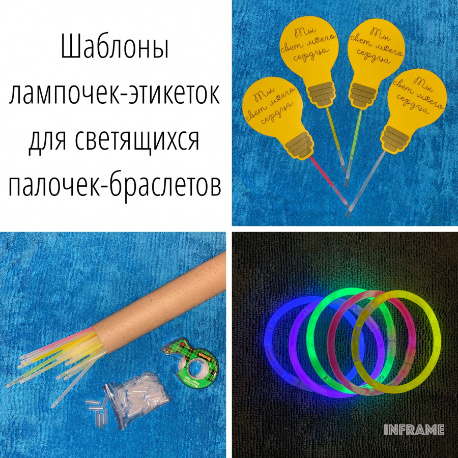 в комплект входят этикетки в виде лампочек с надписью, а также редактируемые этикетки. На фото лампочки, распечатанные на цветной бумаге и заламинированные. Палочка-браслет прикреплена к задней стороне этикетке кусочком скотча. Я сразу надеваю на палочку трубочку-переходник, с помощью которой палочка замыкается в браслет.