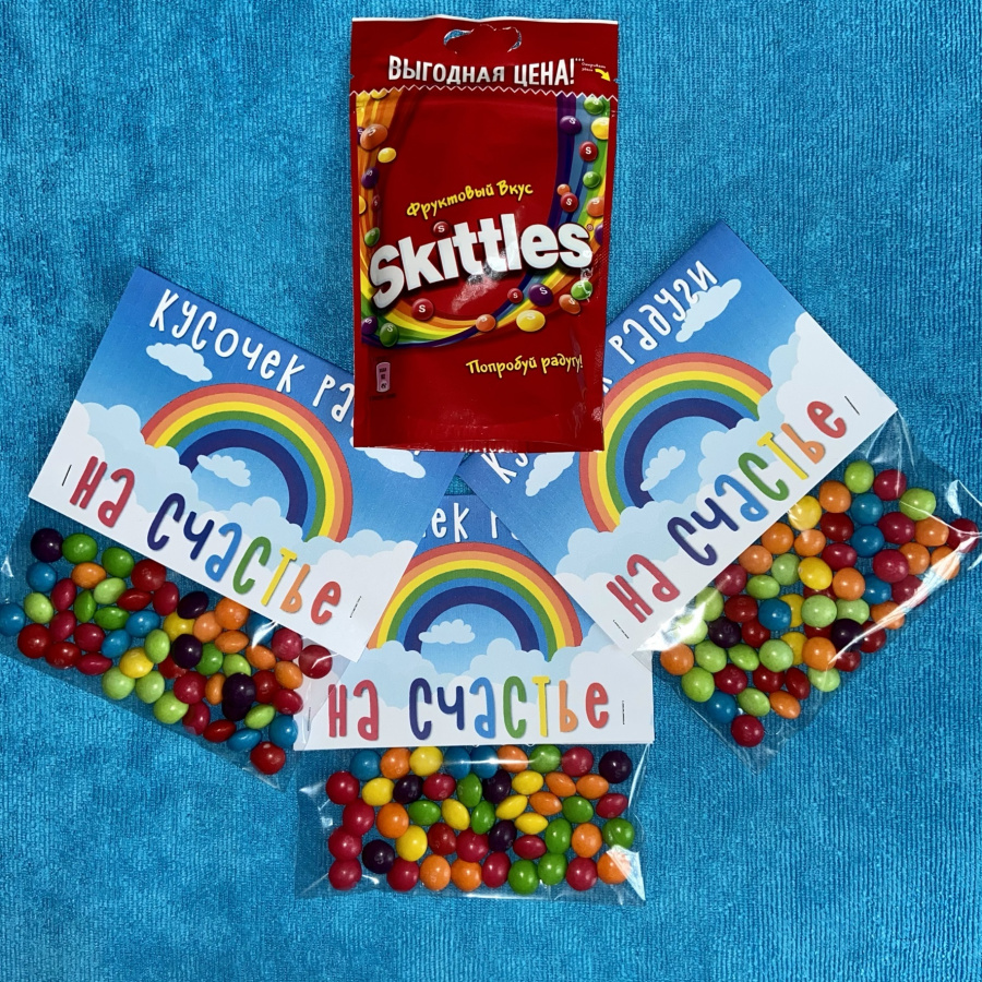 Вам понадобятся прозрачные пакеты около 14 см шириной, степлер, конфеты "Скиттлз" и распечатанные этикетки. Немного конфет в пакетик, закрепить края, чтобы конфеты не высыпались, этикетка сверху закрепляется степлером - и вот, милый подарок, от которого настроение так и поднимается вверх, готов!