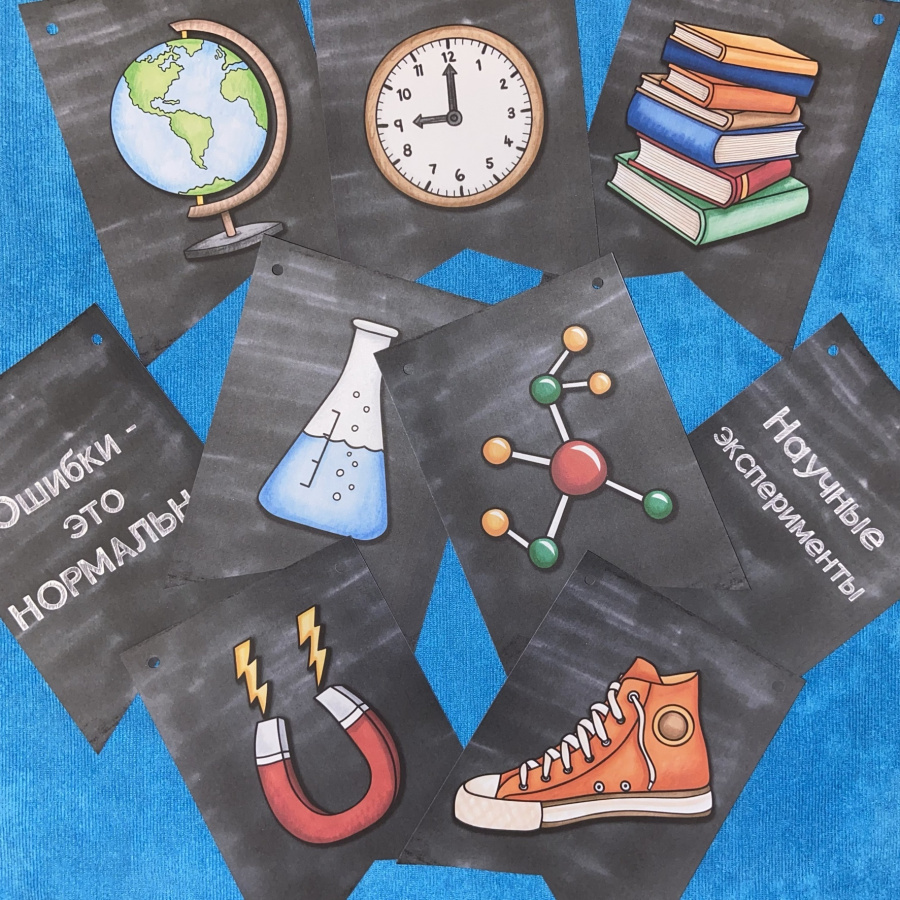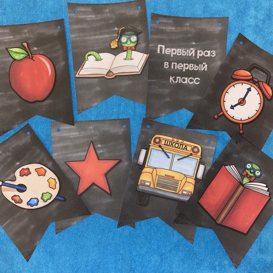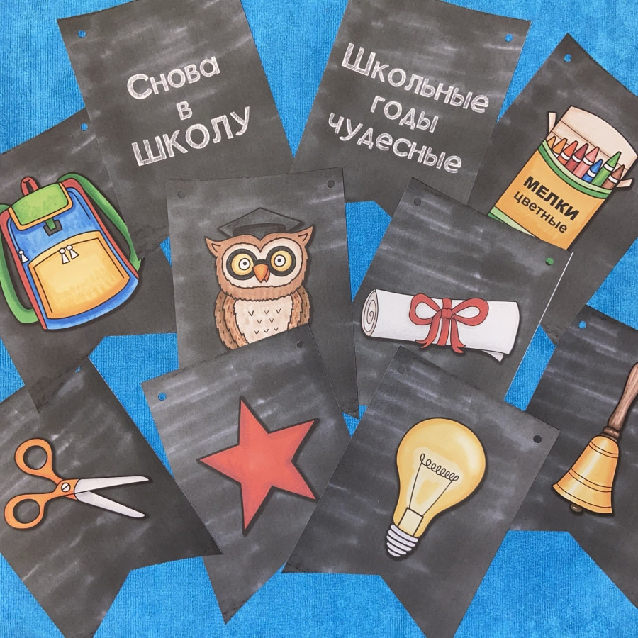 С помощью этого комплекта легко украсить класс не только к началу нового учебного года, но и к тематическим дням, ведь на флажках более 30 разных рисунков. Цветные иллюстрации выполнены английской художницей Kate Hadfield. Она рисует восковыми мелками, а потом оцифровывает изображения. Наверное, поэтому ее иллюстрации такие теплые и притягательные.