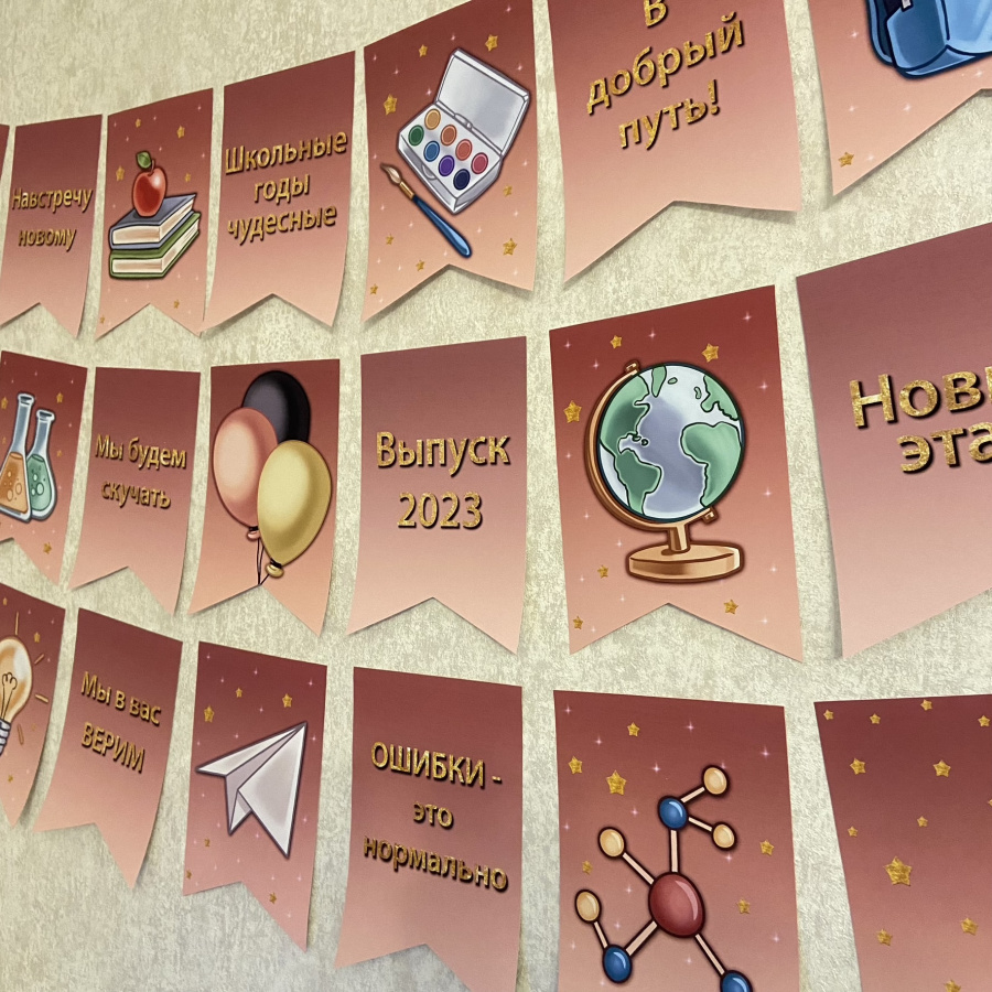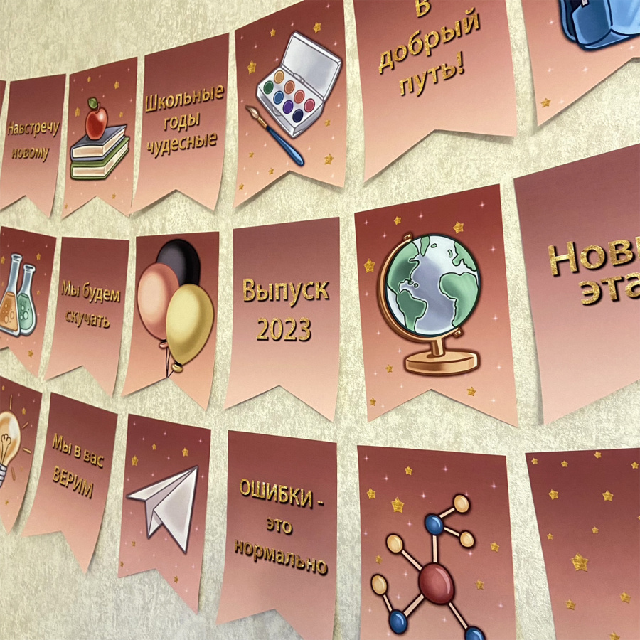 Флажки - самый простой способ украсит класс. Эти флажки яркие и при этом со школьной тематикой, теплые, как поддержка значимых взрослых, праздничные и нарядные. С ними Ваш класс преобразится к выпускному в 4, 9 и 11 классах.