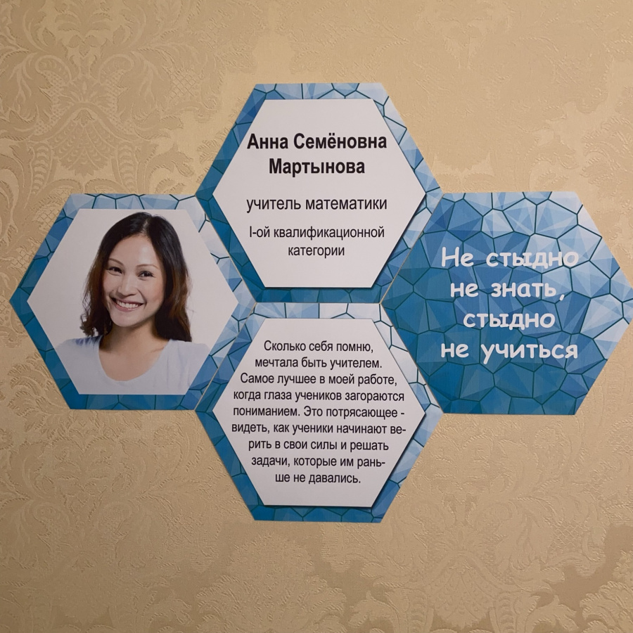 Я предлагаю создать галерею учителей с фото и ответами на важные вопросы. Для этого я создала шаблон, в который можно вставлять фото учителей и других сотрудников школы, а также внести ответ на вопрос, который наши ученики могут получить в процессе интервью с учителями - получается целый проект в начале учебного года или к Дню учителя.