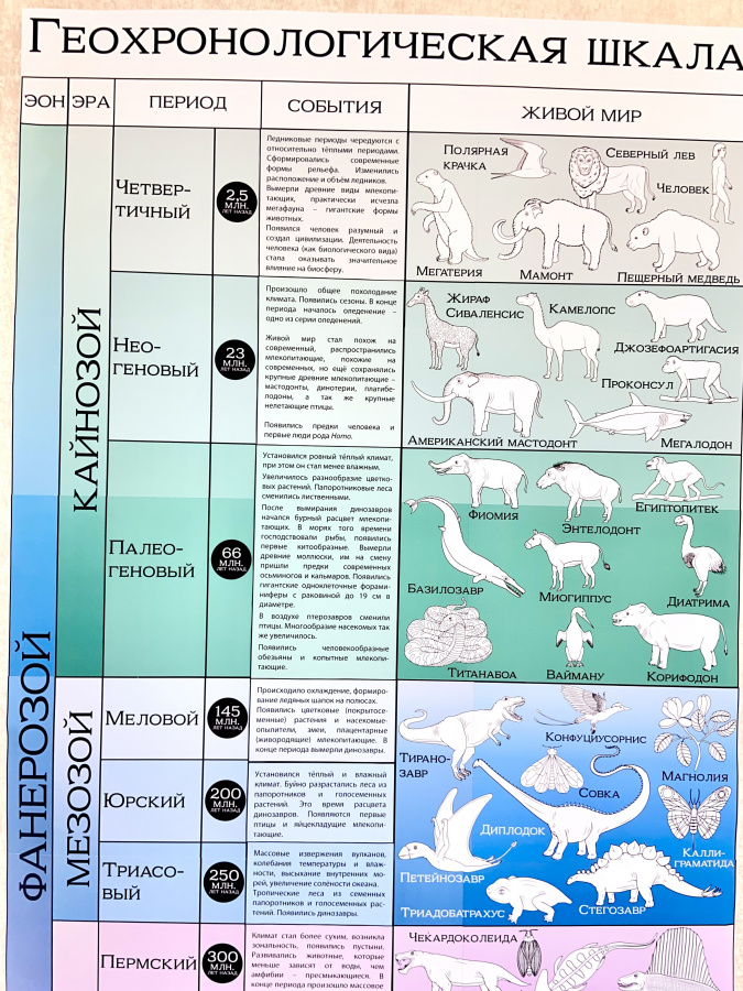Вертикальная геохронологическая шкала занимает мало места. Ее можно разместить возле двери, на двери, в простенке между шкафами или окнами. При этом все ее элементы доступны ученикам. Ее цветовая гамма нейтральная, а изображения организмов, обитавших в разные периоды, контурные черно-белые. И при этом она выглядит привлекательно на стенах любого цвета.