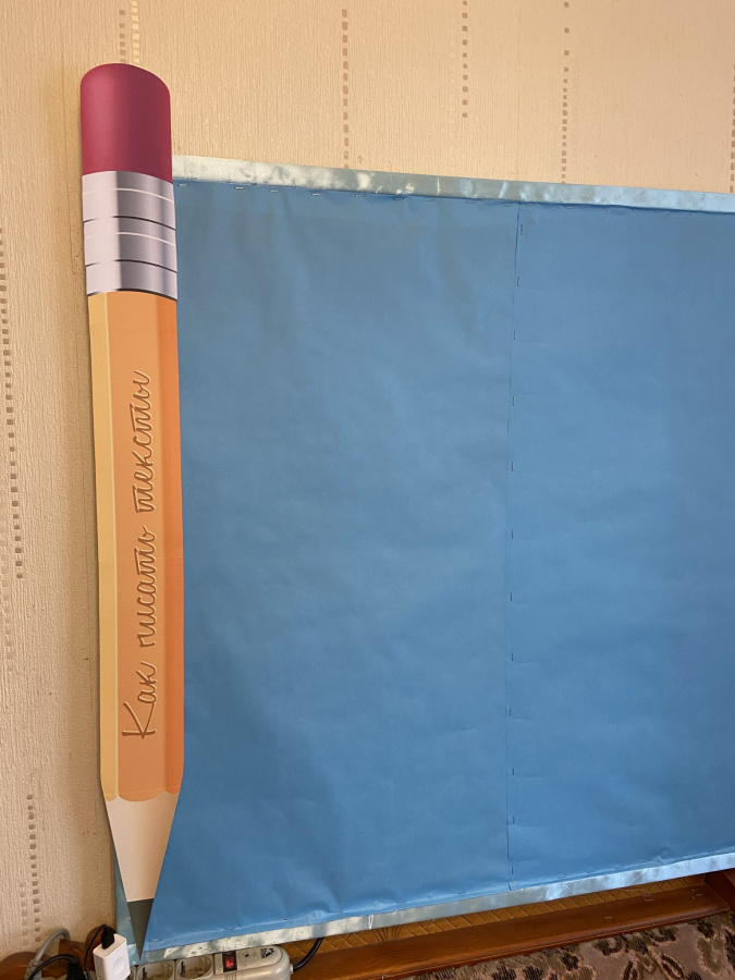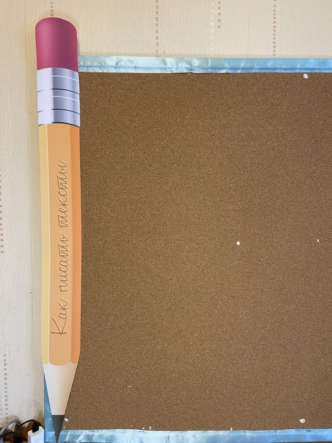 На фото стандартная пробковая доска 120*90 см. Она обтянута голубой крафт-бумагой (в комплекте пошаговая инструкция с видео и фото). Все элементы на листах А4 (размер обычной офисной бумаги). Некоторые элементы (карандаш, часть баблов) состоят из нескольких фрагментов, которые нужно склеивать между собой (есть наглядная инструкция). Для облегчения монтажа элементов на доску есть примерная монтажная схема.