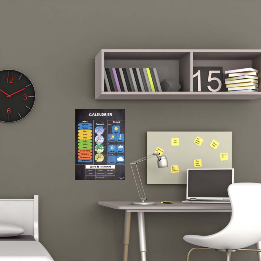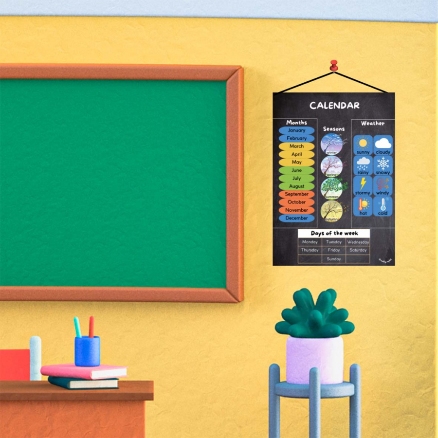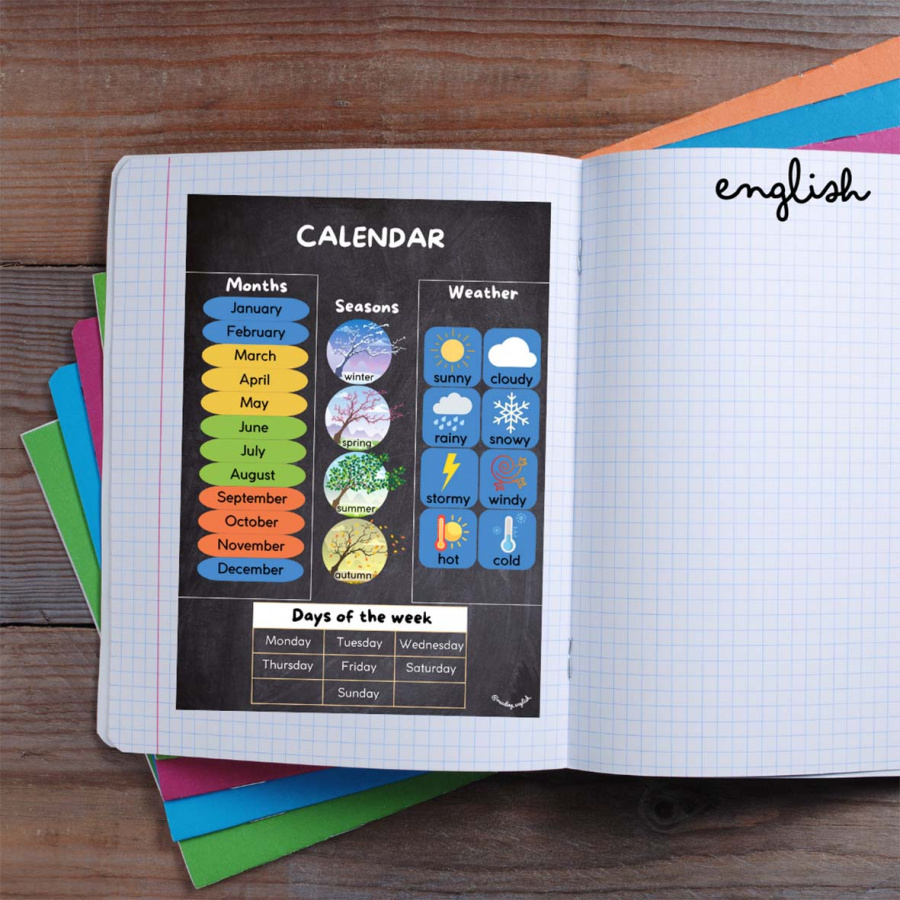 Календарь в двух вариантах: английский и французский язык. В календаре есть информация по месяцам года, дням недели, разным типам погоды и времени года. Очень удобен для использования, так как дети могут быстрее ориентироваться и запомнить по теме.