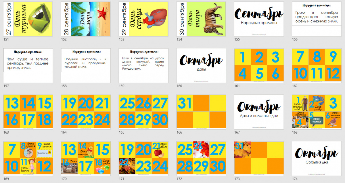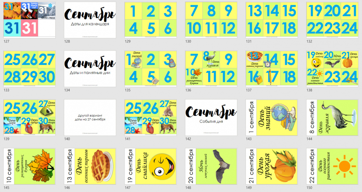 - календарь на текущий месяц (в комплекте 9 месяцев: сентябрь-май): универсальные даты на белом фоне, даты на цветном фоне без иллюстраций, памятные даты с иллюстрациями, ваши собственные даты - подлежат редактированию;