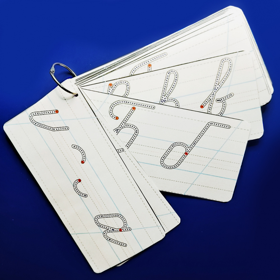 Буквы и элементы обозначены в виде обводки и контура с направляющими стрелками. Карточки представлены с двумя видами линовки: косая линия по типу «Чудо-прописей» и частая косая. Размер каждой карточки 9,5 х 20 см (по 3 шт. на листе А4).