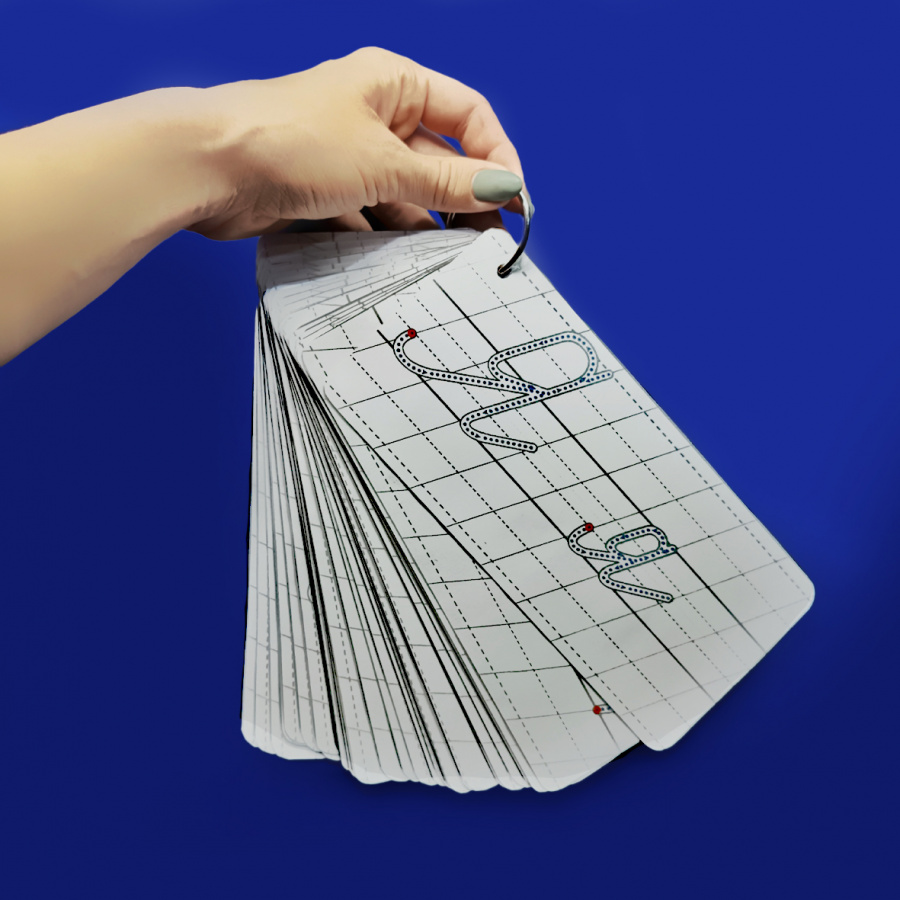 Карточки предназначены для многоразовой работы при помощи маркера. Для этого листы с буквами нужно предварительно заламинировать или поместить в специальный файл «пиши-стирай». Таких много на маркетплейсах, и обычно в комплекте с ним уже идут маркеры на водной основе.