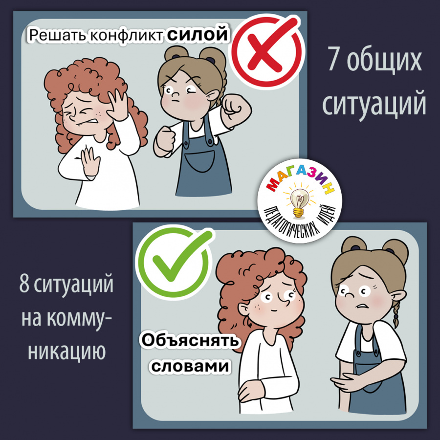 Здесь 15 инструкций, состоящих из примера поведения, как делать не надо, и как надо. На карточках иллюстрация и краткое описание. Условно ситуации можно разделить на 2 части: общеучебные ситуации и коммуникация (в том числе и профилактика травли).