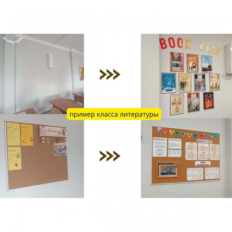 В материалах содержатся следующие шаблоны: а) правила класса, б) префект/актив класса, в) расписание, г) дни рождения, д) флажки, е) бонус: слово BOOKFLIX (по аналогии с NETFLIX- сервис просмотра фильмов + book- книга), в нашем случае "реклама" топ 10 книг текущего года.