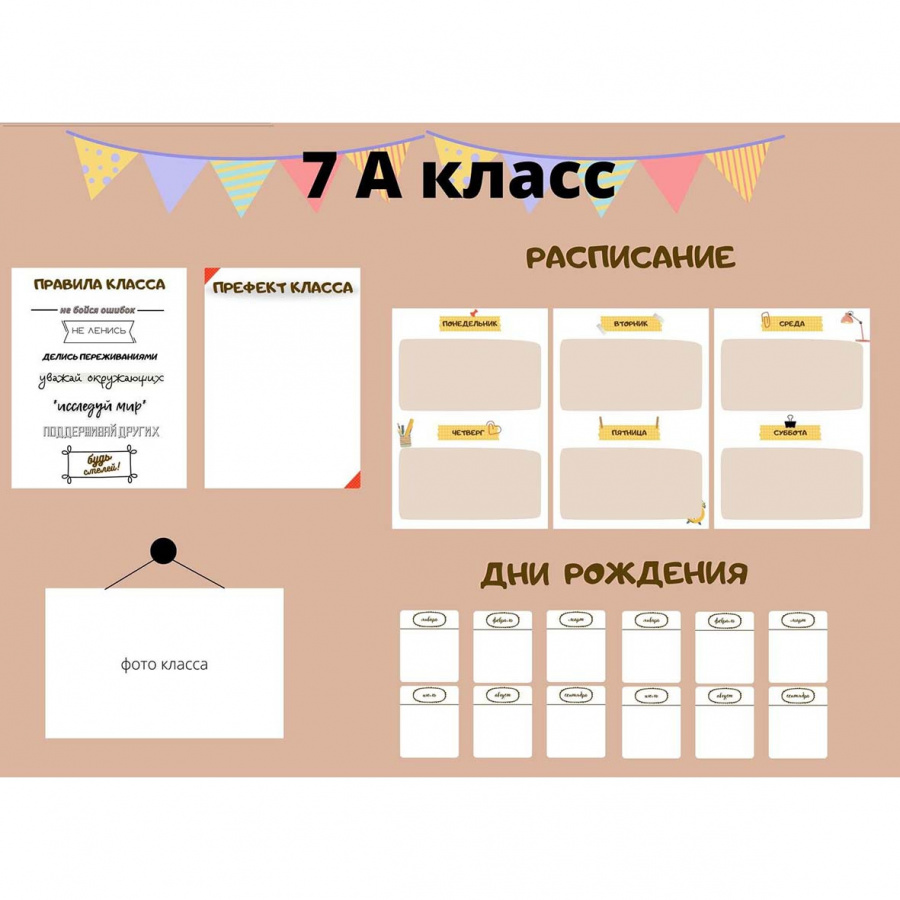 Шаблоны для оформления классного уголка в спокойных оттенках, подойдут как для малышей (если добавить яркие флажки), так и для учеников старших классов.