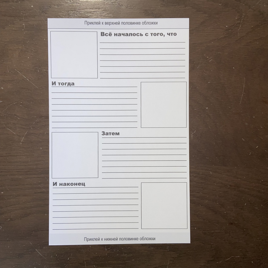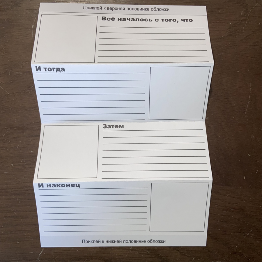 Распечатайте страницы с этапами истории. Обложек и страниц с этапами нужно подготовить по количеству учеников в классе или по количеству пар/групп, которые будут создавать свои книжки.