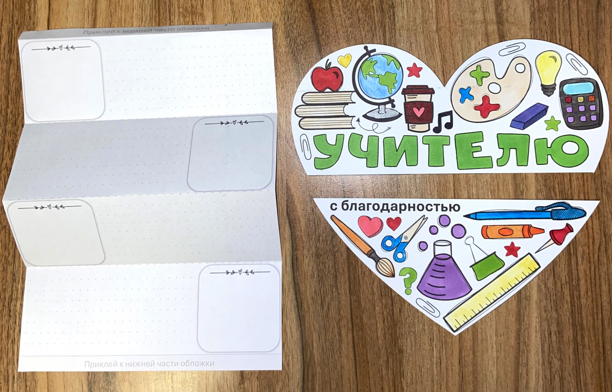 Эта эффектная книжка-гармошка станет милым подарком учителю от учеников. Необычный дизайн, простота сборки, экономичная черно-белая печать. Она выглядит так привлекательно, что руки так и тянутся, чтобы начать раскрашивать. В качестве бонуса я добавила простую открытку в виде сердца в двух размерах (1 сердце на А4 и 2 на А4), на них можно написать добрые слова, пожелания и благодарности, а так же прикрепить на оборот конфетку/шоколадку.