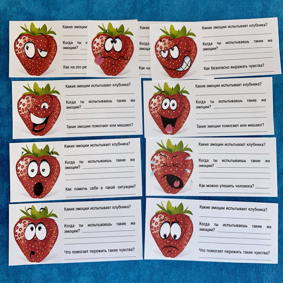 - Карточки для классного часа "эмоциональная клубника" - карточки для индивидуальной работы и для доски. Задорная клубника-персонаж поможет лучше распознавать свои чувства и проявления чувств других людей, а также просить о поддержке и оказывать ее тем, кто в этом нуждается. Такое занятие можно провести не только в любое время учебного года, но и в летнем/пришкольном лагере. Карточки можно использовать для разрешения конфликтов и вместе с трекерами настроения.