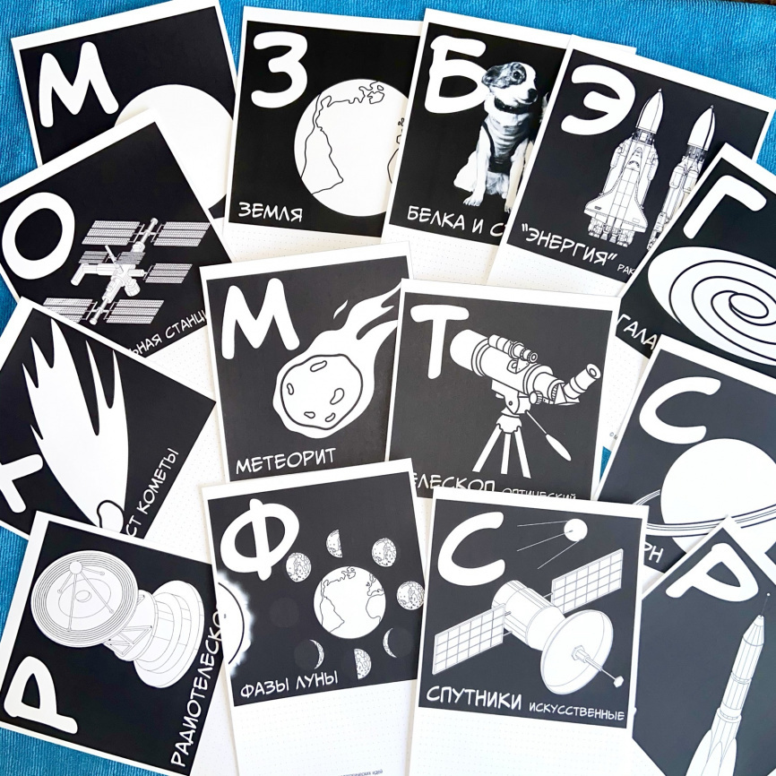 4 игровых поля и 4 варианта игры, 63 карточки со словами космической тематики (чтобы можно было выбрать подходящие). Игра двух пар на одном поле (формат А4).