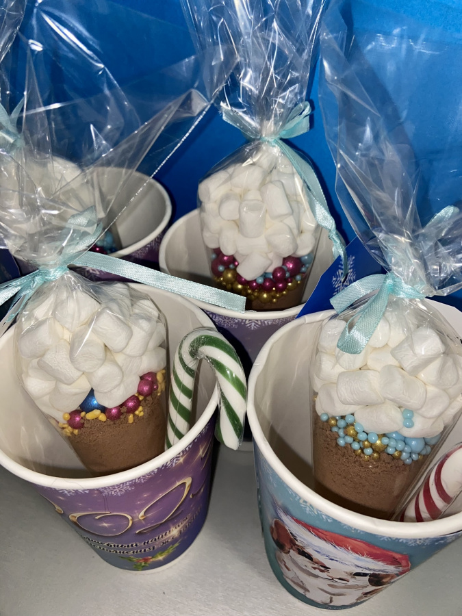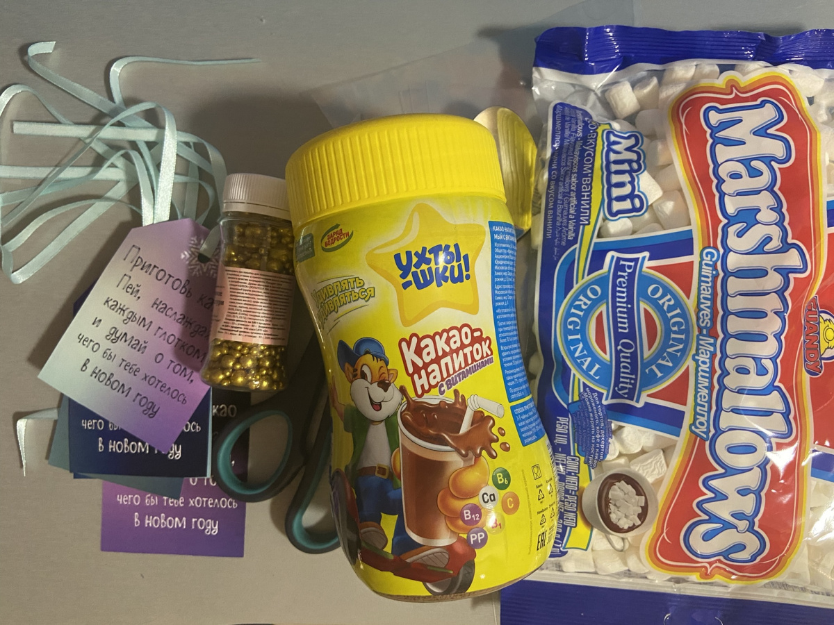 На класс нужно 2-3 банки какао "Несквик" - его не нужно варить, достаточно растворить в теплой воде (или молоке, если дети будут готовить какао дома). Так же Вам потребуются кондитерские посыпки и маршмеллоу (я использую мелкие, но можно и обычного размера).