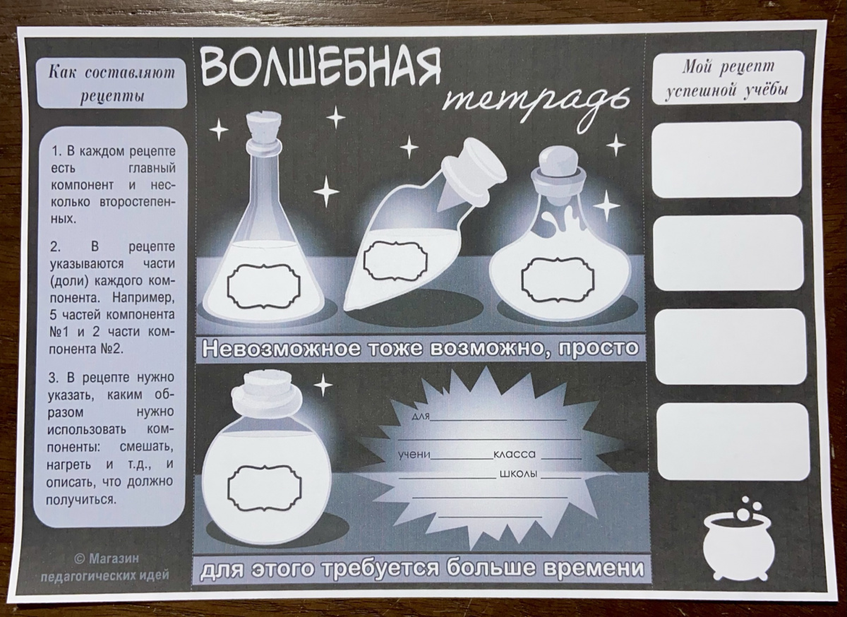 Если Вы учите юных волшебников и бытовая алхимия Вам не чужда, предлагаю приготовить собственный эликсир успеха и записать его рецепт на обложке теради. Обложки-раскраски "Волшебная тетрадь" специально для этого!