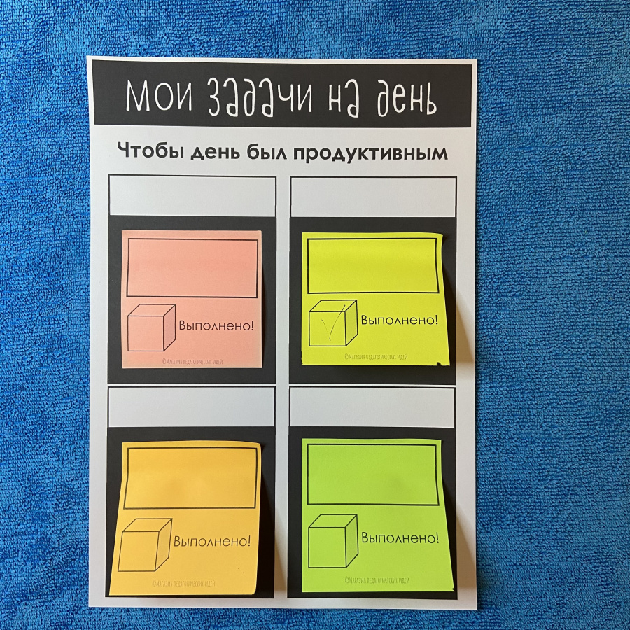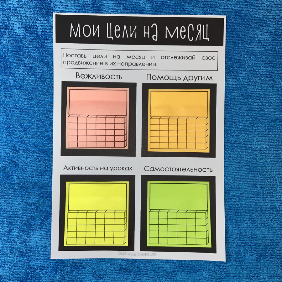 Наклейте на окошки подходящие стикеры – на них Ваши ученики будут записывать свои цели и отмечать продвижение. Можно использовать один стикер для каждого окошка на весь период, или наклеивать ежедневные стикеры поверх предыдущих.
