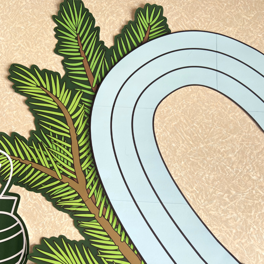 Размеры сердца 75*60 см и, несмотря на сложную форму и черные линии, склеивается легко и четко по инструкции. Надписи на подложках, чтобы не пришлось вырезать мелкие детали и прорезать отверстия внутри букв. Печать на листах А4. Гирлянда и еловые ветви на темно-зеленых подложках, имитирующих цвет доски, чтобы облегчить вырезание. Остальные элементы оформления - имитация меловых рисунков и надписей - бледно-голубые контуры на темно-зеленом фоне.