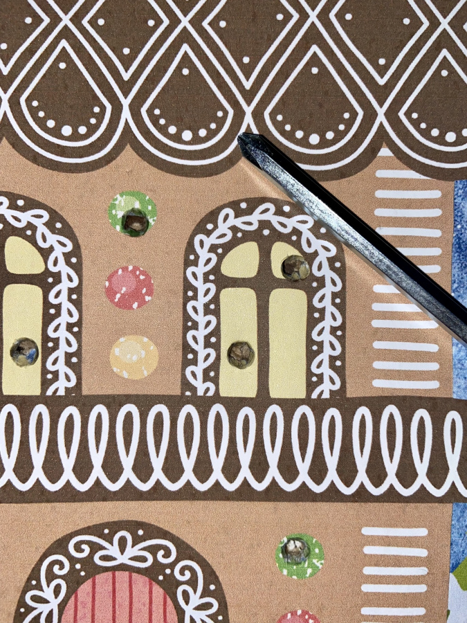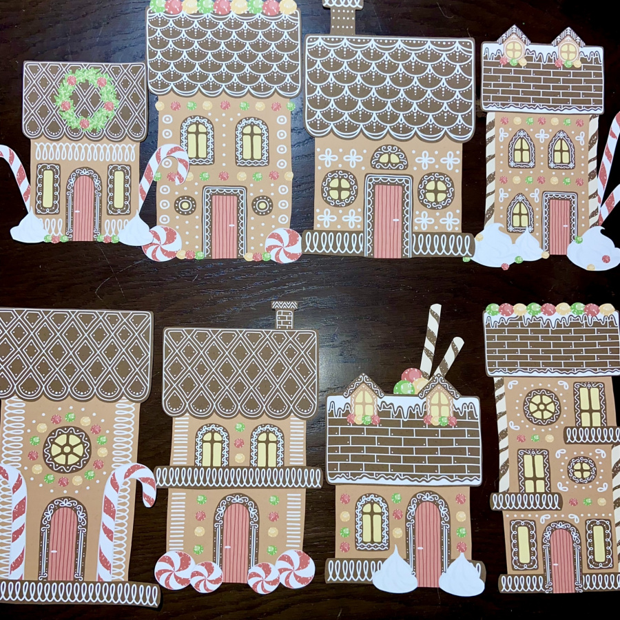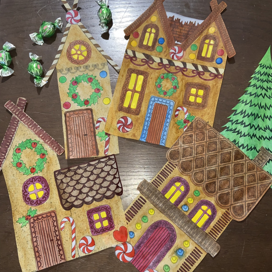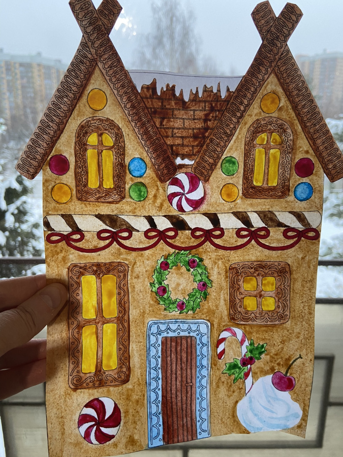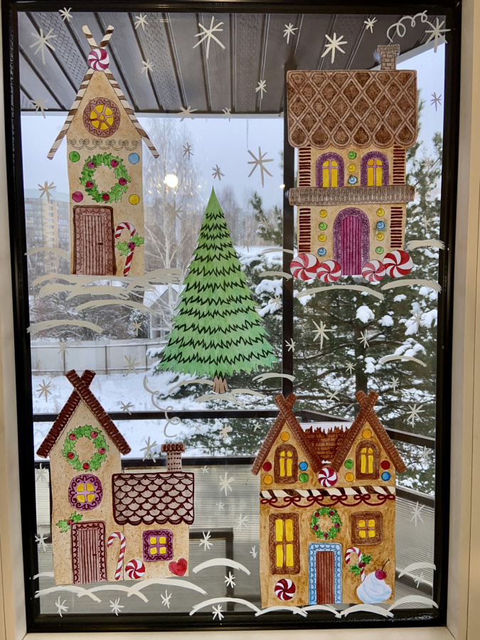 Эти пряничные домики просто бомба! Из них можно сделать панораму с гирляндой или витраж на стекло. Будет оформлен и подоконник и стекло каждого окна в классе и дома.