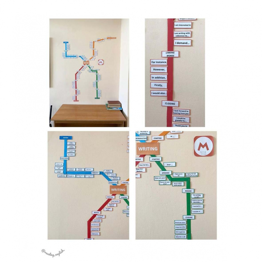 Mind Map в виде карты метро по опорным словам в разных стилях письма поможет детям не только правильно оформлять свои письменные работы, но и даст возможность зрительно запомнить ключевые фразы, которые им понадобятся не только по школьной программе, но и при сдаче экзаменов на знание английского, на работе и в повседневной жизни. Плюс это замечательное украшение кабинета, которое несомненно привлечет внимание учеников.
