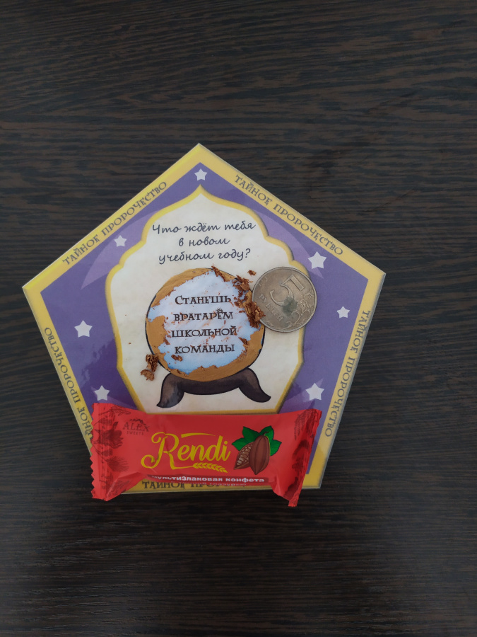 В начале учебного года многие учителя дарят небольшие подарки своим ученикам. Открытки «Тайное пророчество» точно понравятся ученикам любого возраста. Здесь и скрытая в предсказаниях мотивация, и элемент волшебства (пророчество под скретч-слоем), и сладкий приз.