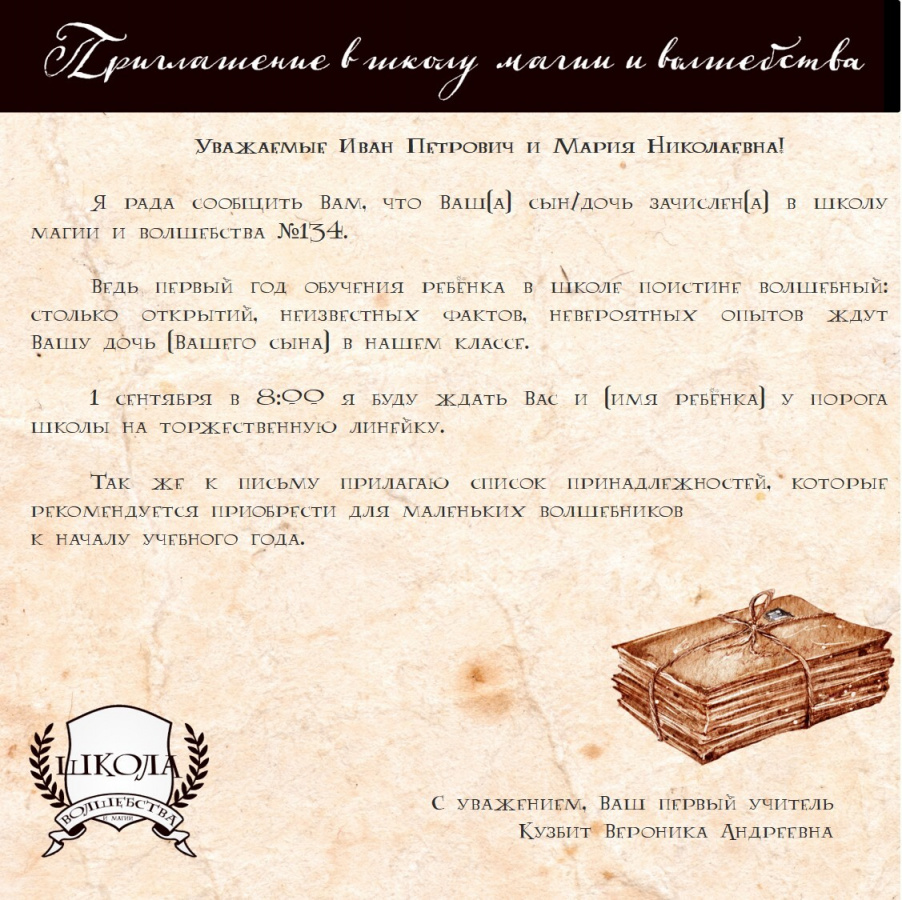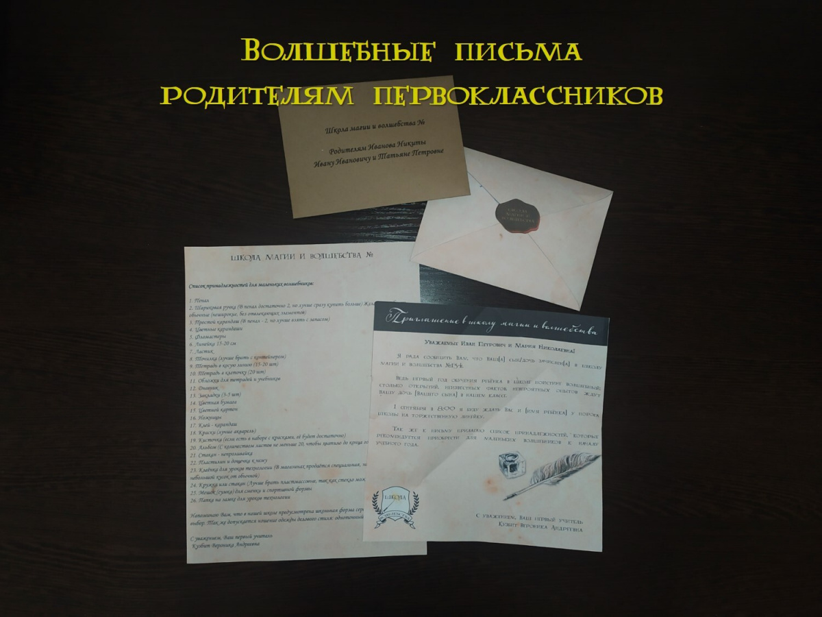 При поступлении в школу волнуются не только дети, но и родители. Даже если в семье уже есть старшие дети, всегда найдутся вопросы, на которые никто не ответит лучше, чем первый учитель конкретно этого ребёнка. Волшебный конверт с письмом от первого учителя поможет закрыть ряд вопросов от родителей, снимет тревожность, а ещё совершенно точно поднимет настроение.