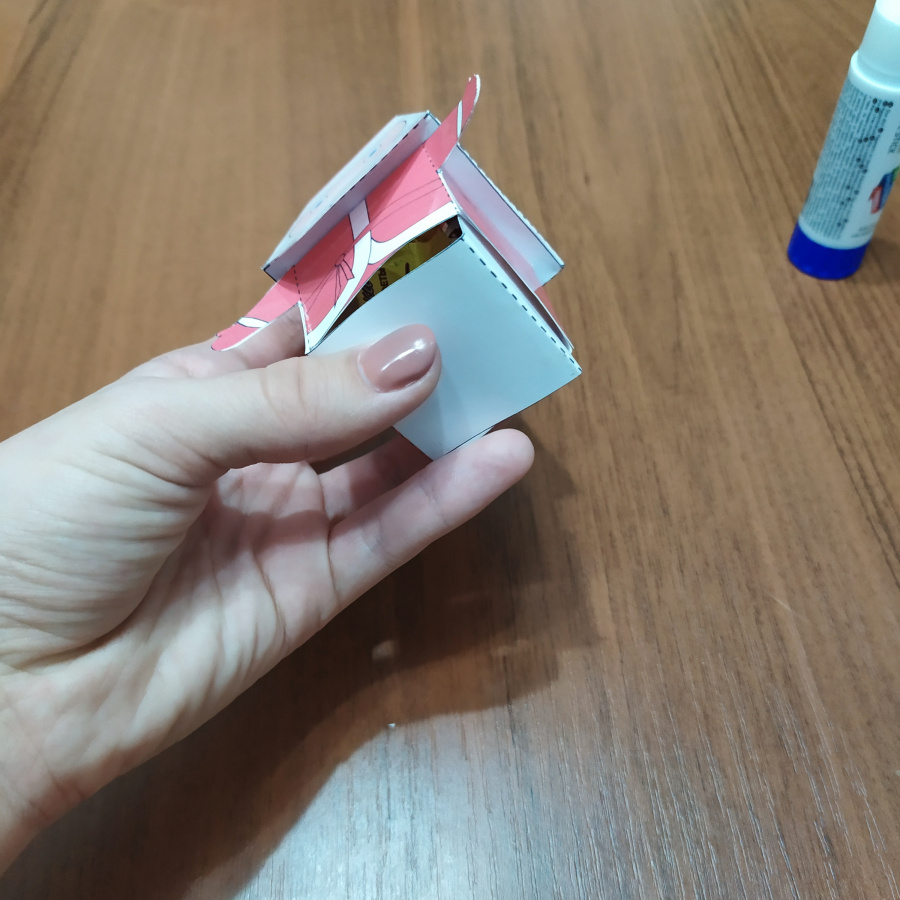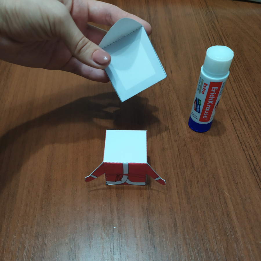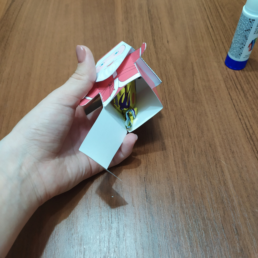 Внизу фигурки есть ниша с крышкой, что позволяет спрятать в «Деда Мороза» небольшой сюрприз, например, конфету или записку с пожеланиями. В случае, если сюрприз окажется слишком тяжелым, край коробки можно зафиксировать маленьким кусочком скотча.