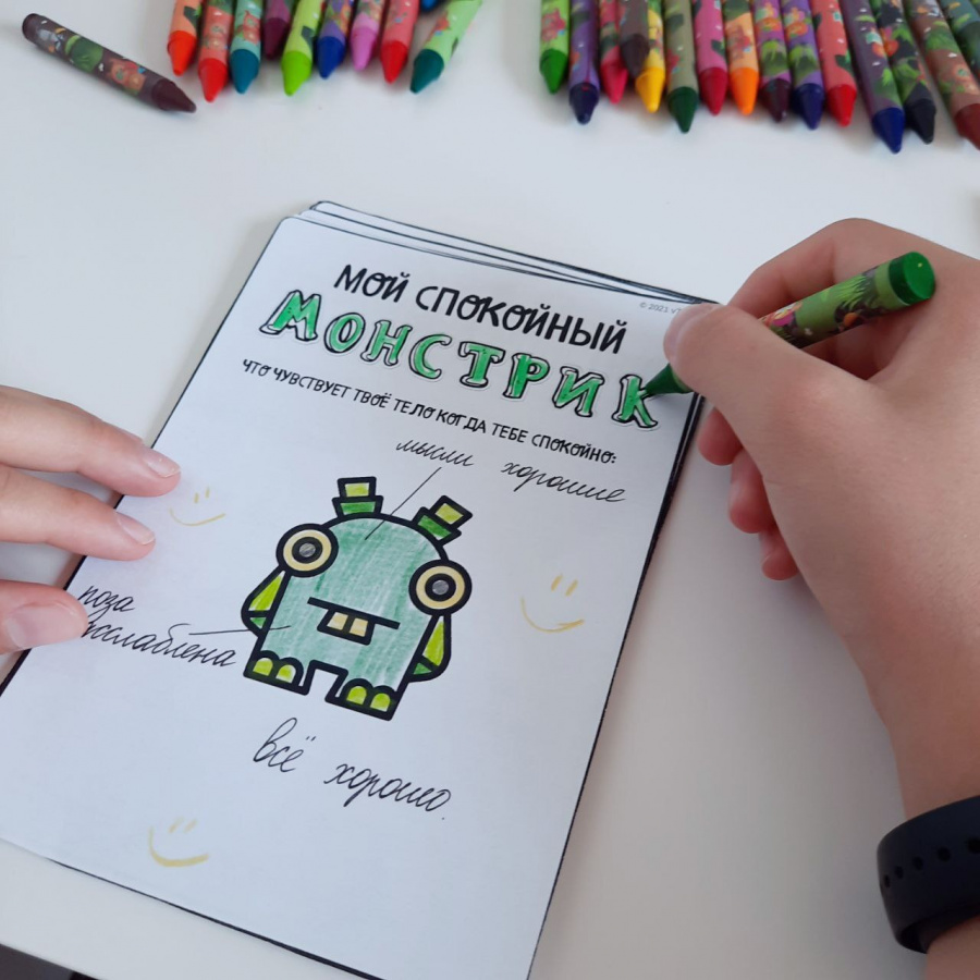 Каждый выражает свои эмоции по-разному. Когда тревожатся, некоторые люди начинают трясти ногами, некоторые скрипят зубами, некоторые сжимают кулаки, у некоторых возникает напряжение в груди. Определить, как мы выглядим, когда мы испытываем определенные эмоции, нам поможет упражнение "Мой монстрик" чтобы знать, когда мы начинаем испытывать определенную эмоцию (назвать тему занятия), и можем затем сделать что-нибудь, чтобы успокоиться.