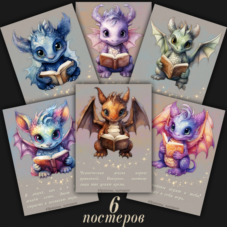 В этих постерах юные драконы-читатели и их мысли. 6 постеров размера А4 для цветной печати. Два варианта: светлый и темный текст. Файл с инструкцией по настройке печати в высоком разрешении для обычного принтера в комплекте. Текстура бумаги будет пропечатана принтером. Идеально использовать матовую фотобумагу.