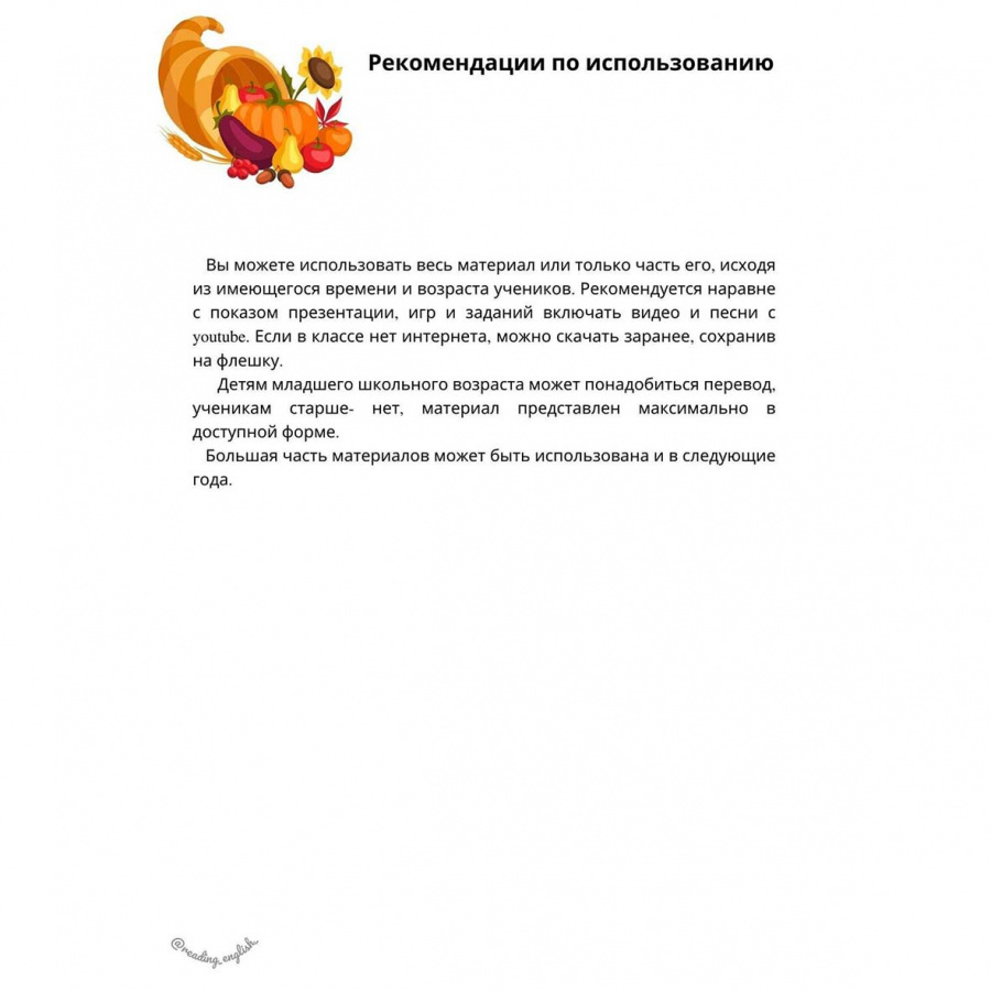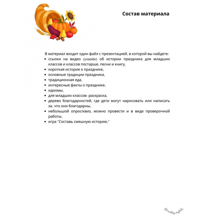 День благодарения, широко празднуемый в США, не может обойти нас стороной, если мы изучаем английский язык. В материале вы найдете презентацию, в которой есть коротко обо всем (история, традиции, традиционная еда, идиомы, активные ссылки на видео и песни в youtube), а также активности для учеников как младшего возраста, так и старшего.