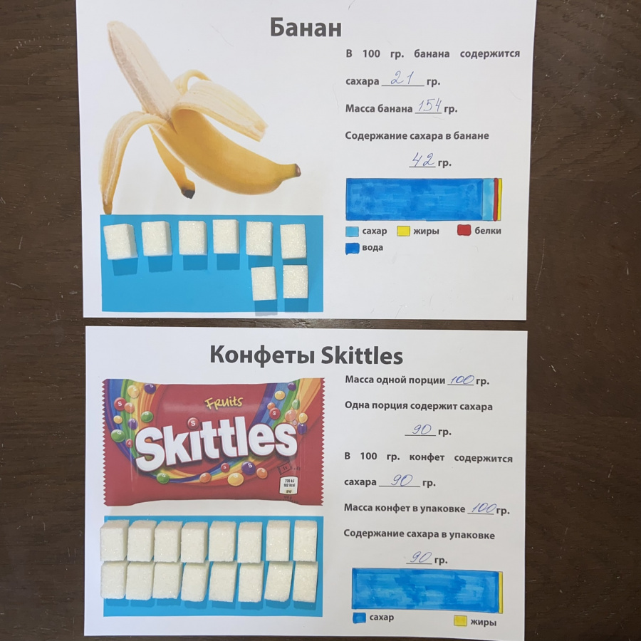 Ребята будут изучать упаковку продуктов питания (сладости), чтобы выяснить, сколько сахара (добавленный сахар) входит в их состав. А затем будут рассчитывать соответствующее количество кусочков сахара-рафинада и производить взвешивание на весах (обычные кухонные подойдут). Кубики сахара они закрепят на рабочих листах, раскрасят диаграммы и сопоставят количество сахара в этих сладостях и фруктах и овощах. особенно здорово, когда ребята сами приходят к выводу, сколько конфет можно съест в день, чтобы это не имело последствий для их здоровья, и каким количеством фруктов (или моркови) можно заменить любимые сладости.