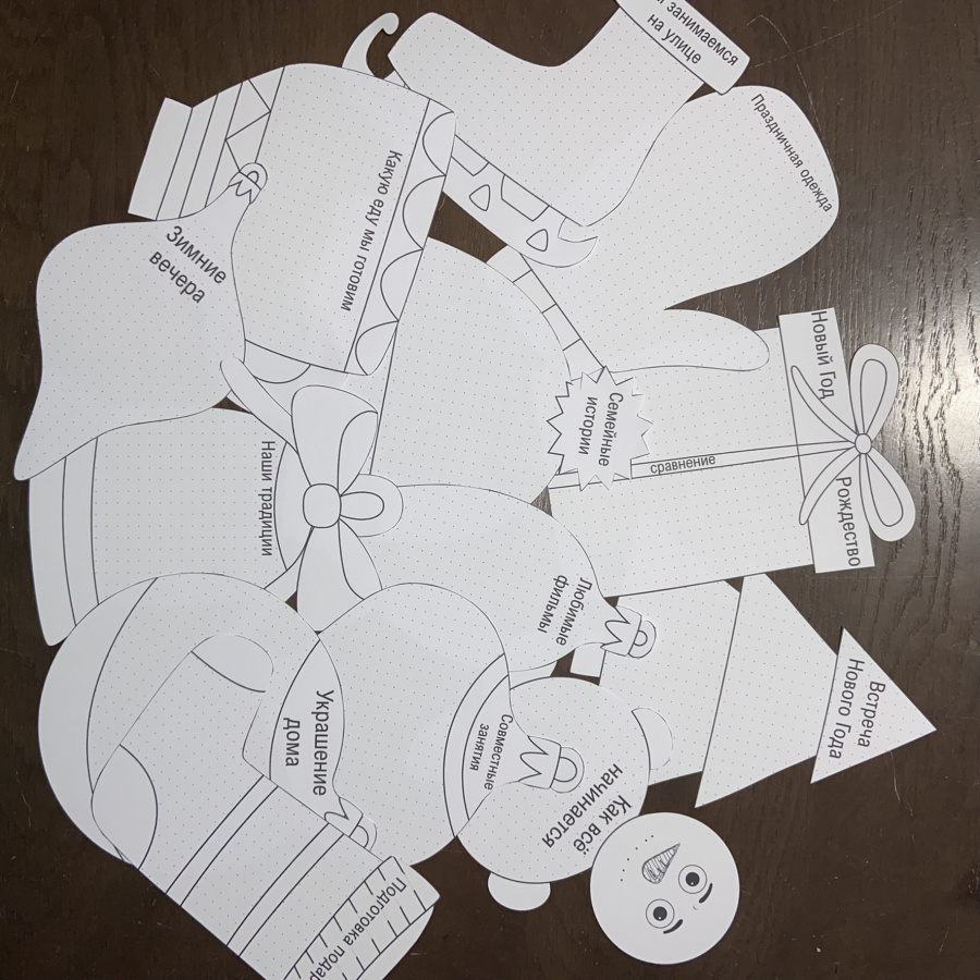 Элементы венка - елка, подарок, снеговик, елочные украшения, шапка, варежки, коньки с выполненными на них заданиями, наклеиваются на круг-основу. Можно предложить своим ученикам раскрасить все элементы или распечатать их на цветной бумаге, чтобы оформление заняло меньше времени.