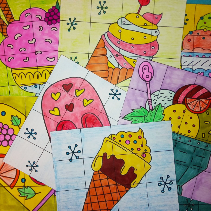 Секретные картинки - это задания, в результате выполнения которых Ваши ученики соберут картинки аппетитных холодных десертов. Задание состоит из двух частей: в ячейках левой части - задачи, примеры, вопросы - все, что Вы решите в них разместить, а на карточках правой стороны - ответы. Вначале ребенок получает левую часть страницы, в ячейки которой записывает ответы, а после этого - карточки правой части, и совмещает ответы с заданиями, собирая из фрагментов целую картинку. В каждом варианте четыре лишние карточки, на которые нужно разместить ответы с типичными ошибками.