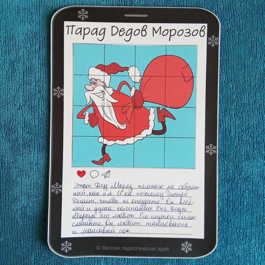 А ещё есть шаблон смартфона, чтобы можно было вклеить рассекреченного Деда Мороза и написать что-нибудь про него. И положила три варианта заданий Найди и сосчитай с Дедами Морозами, чтобы тем ребятам, которые закончили раньше всех тоже было чем заняться.