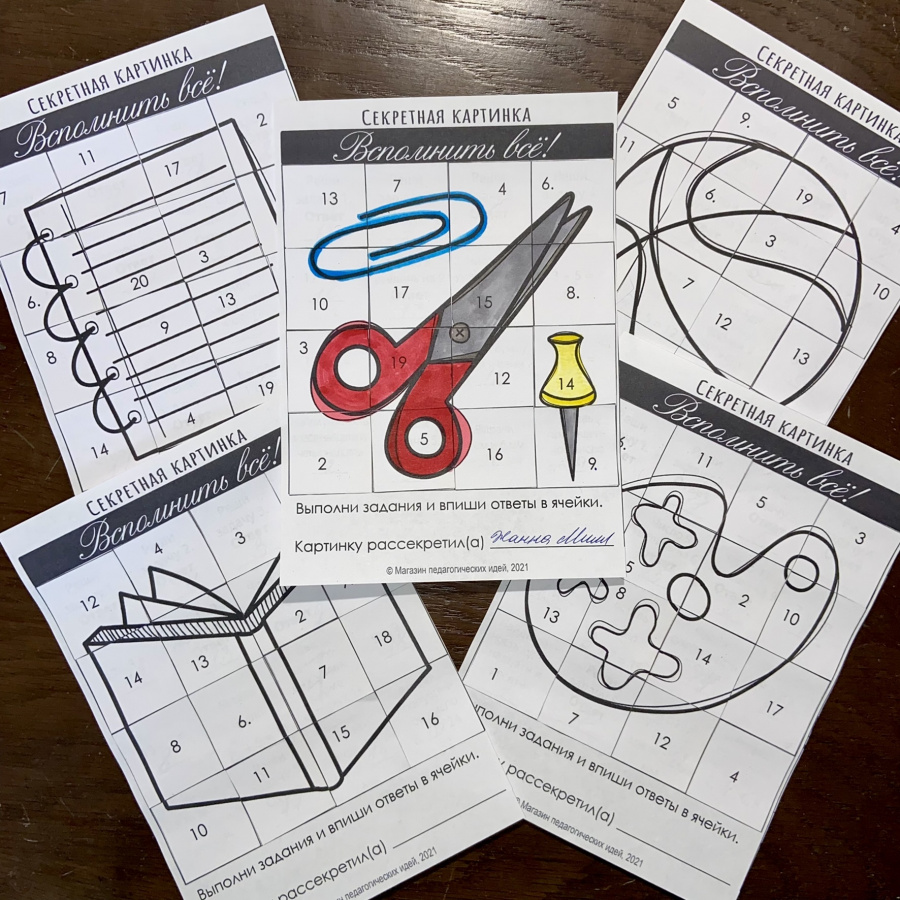 Секретные картинки - это задания, в результате выполнения которых Ваши ученики соберут изображения школьных принадлежностей. Задание состоит из двух частей: в ячейках левой части - задачи, примеры, вопросы - все, что Вы решите в них разместить, а на карточках правой стороны - ответы. Вначале ребенок получает левую часть страницы, в ячейки которой записывает ответы, а после этого - карточки правой части, и совмещает ответы с заданиями, собирая из фрагментов целую картинку. В каждом варианте четыре лишние карточки, на которых ответы с типичными ошибками.