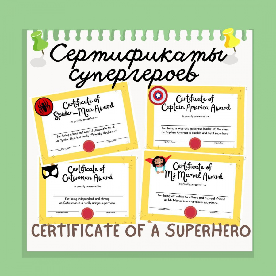 Сертификаты супергероев на английском языке - это продукт в электронном виде (файл PDF). Скачать материалы можно в личном кабинете - сразу после оплаты и в любое удобное время.