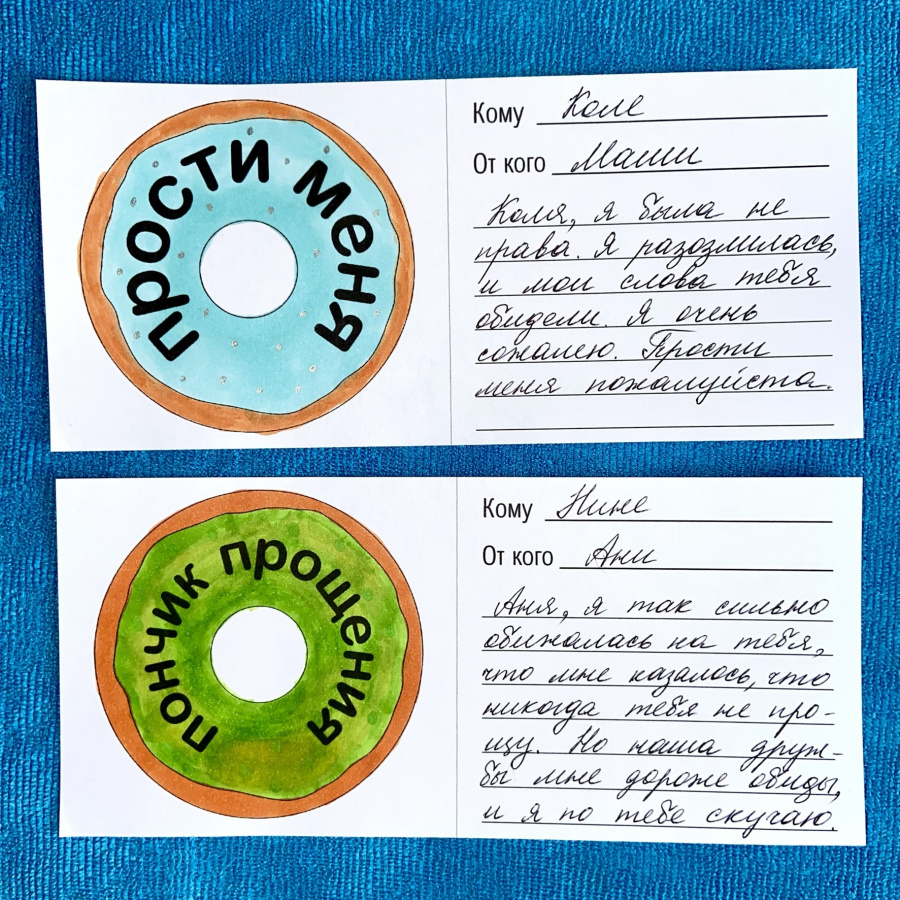 Все остальные шаблоны – это записки с пончиками – такая возможность для стеснительного или косноязычного ребенка попросить прощения, предложить дружбу, поддержать и т.д.